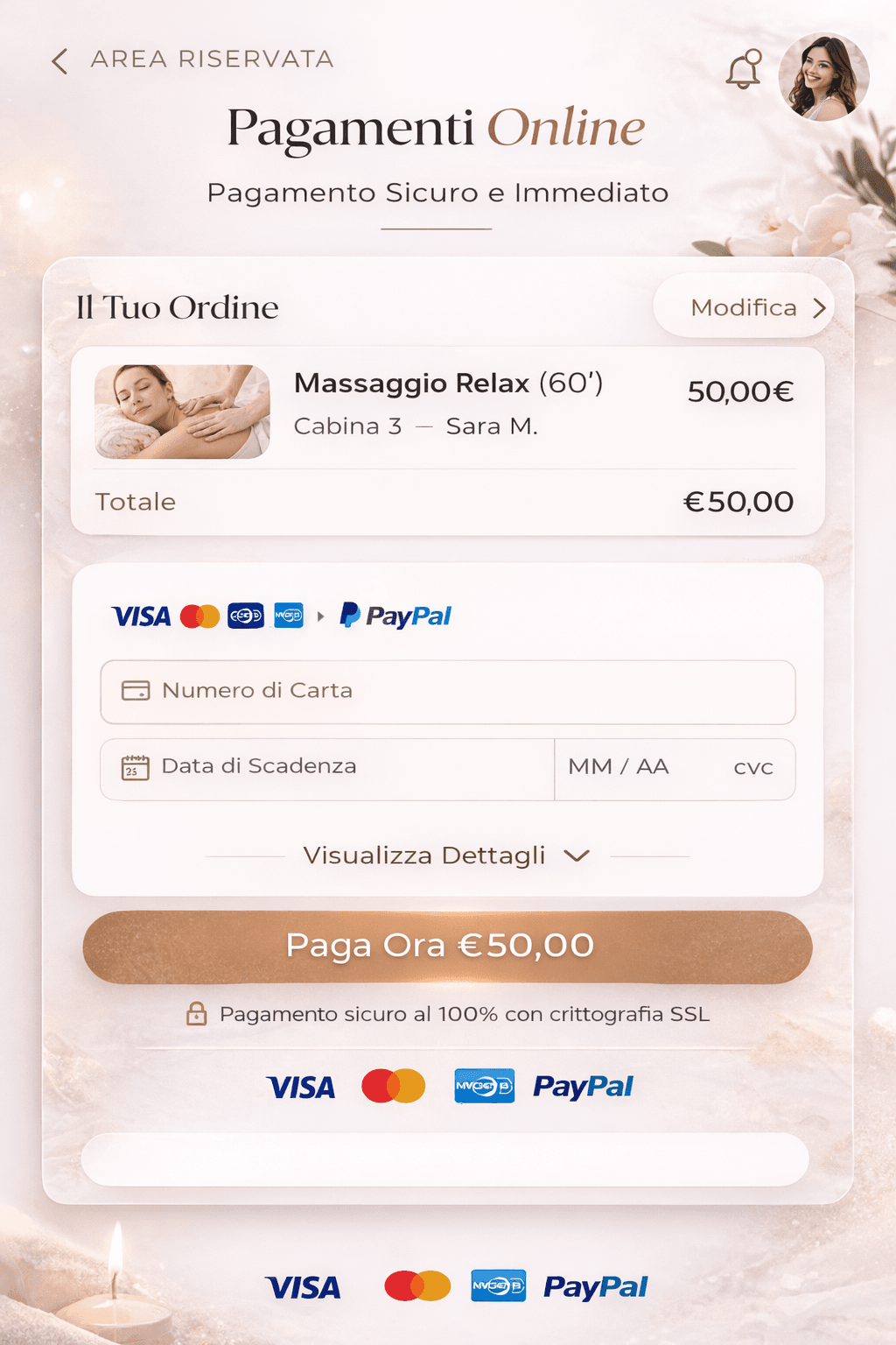 Il cliente paga in modo semplice e sicuro tramite carta o PayPal, direttamente dall’area riservata o dal sito.